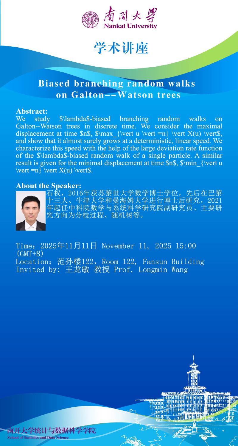 Biased branching random walks on Galton--Watson trees(石权)